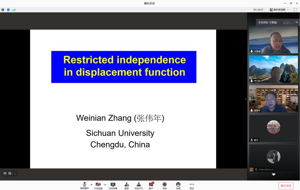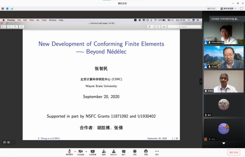 论坛邀请院士、杰出青年基金获得者共10位数学领域的资深专家作线上特邀报告。中国数学会理事长、中国科学院院士、北京大学田刚教授作了题为“欧拉数与几何”的邀请报告;国际工业与应用数学联合会主席、中国科学院院士、中国科学院数学与系统科学研究院袁亚湘教授作了题为“大数据与优化方法”的邀请报告;中国科学院院士、中国科学院数学与系统科学研究院周向宇研究员作了题为“从复数谈起”的邀请报告;中国科学院院士、中国科学技术大学叶向东教授作了题为“The parallels between topological dynamics and ergodic theory”的邀请报告;欧洲科学院外籍院士、中国科学院自动化研究所脑网络组研究中心主任蒋田仔研究员作了题为“以数学为基础的脑网络组学及其对类脑智能的启示”的邀请报告;国家杰出青年基金获得者、广州大学庾建设教授作了题为“登革热等蚊媒传染疾病的防控与数学建模”的邀请报告;哥伦比亚大学傅氏基金会应用数学讲席教授杜强教授作了题为“Nonlocal modeling, analysis and computation: some recent development”的邀请报告;北京科学计算研究中心应用与计算数学研究部主任张智民教授作了题为“H(curl curl)-conforming and H(grad curl)-conforming finite elements-beyond Nedelec”的邀请报告;国家杰出青年基金获得者、上海交通大学肖冬梅教授作了题为“From local to global dynamics in Lotka-Volterra systems”的邀请报告;国家杰出青年基金获得者、四川大学张伟年教授作了题为“Restricted independence in displacement function”的邀请报告。